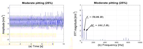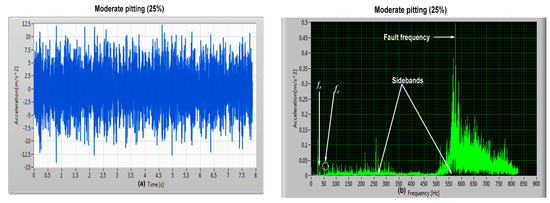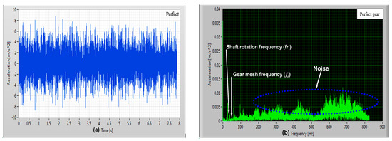The vibration signals measured during the meshing of the pitted spur gear are shown in Figure 15a. In comparison to a normal state, as shown in Figure 14a, it is observed that the vibration’s amplitude is higher.
