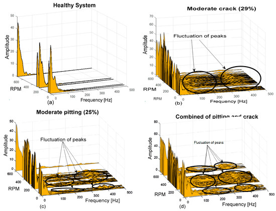 The modulation effect of the fluctuating vibration signal impacted by the coexistence of pitting and cracking can be noticed from the FFT spectrum in Figure 19b, and it is observed that the characteristic frequencies (fr and fe) are significantly affected. It has been observed that the sidebands and harmonic amplitudes of pitted and cracked gears can be directly identified from the RPM–frequency map, as shown in Figure 19c.