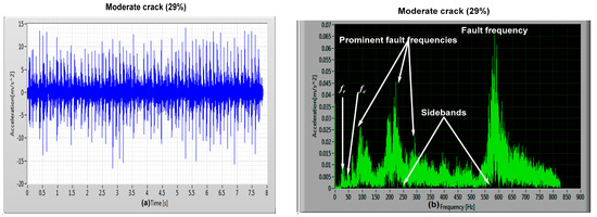 Figure 16a depicts the vibration signals measured during the meshing of the cracked spur gear. In comparison to a normal state, as shown in Figure 14a, it is observed that the vibration’s amplitude is higher.