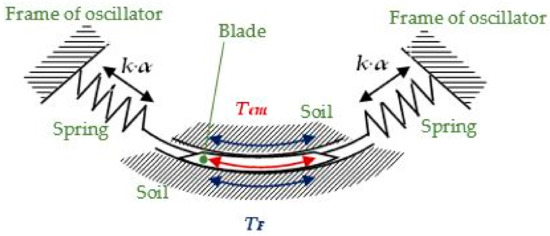 Single degree of freedom system to which the oscillating blade within the soil can be traced under the effect of the excitation torque Tem, the friction torque TF, and the elastic torque k·α.