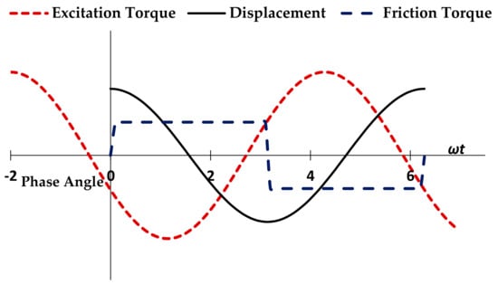 Blade angular displacement α vs. ωt angle. The excitation torque Tem with the phase angle ϕ, as predicted by Den Hartog’s theory, is also shown. Furthermore, the rectangular wave of the friction torque TF, which obeys Coulomb’s law, is present. The rectangular wave of TF is π/2 out of phase with the displacement α because TF is in phase with the angular velocity of the blade oscillation .