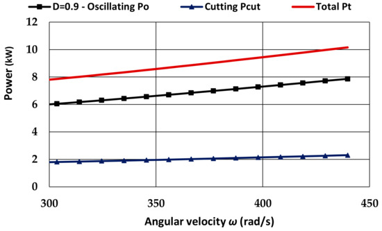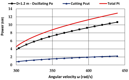 The choice of the best excitation frequency ω value must be made between the minimum limit of 360 rad s−1 to have the maximum linear displacement of the blade (Figure 7) and the maximum limit of 420 rad s−1, which depends on the resistance of the blade and the oscillator materials. Considering that the total energy required practically does not depend on ω, the optimal value between these limits depends only on two factors: (1) the cutting time tcut, which must be minimized, maximizing ω (Figure 9); and (2) the total power required Pt, to be minimized by minimizing ω (Figure 10, Figure 11 and Figure 12). Since even in the most onerous condition with the 1.2 m blade diameter, the difference in total theoretical power Pt required between 360 and 420 rad s−1 is just +3.2 kW, it is advisable to operate at maximum ω, given that in this way, a reduction of 25% in the cutting time tcut is obtained.