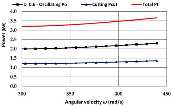 Oscillating power Po, cutting power Pcut, and total power Pt calculated for the blade diameter D = 0.6 m vs. excitation frequency ω.