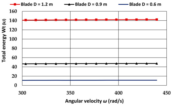 Theoretical total energy Wt vs. excitation frequency ω and blade D diameter.