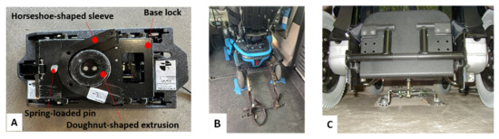 The QLX WDS prototype consists of 2 core interlocking components accompanied by a touchscreen graphical user interface and manual release handle. The interlocking components include the “base lock” mounted to the vehicle chassis and “the horseshoe-shaped sleeve” mounted to the wheelchair undercarriage. The “base lock” uses a linear actuator and scissor mechanism with a doughnut-shaped extrusion designed to connect with the “horseshoe-shaped sleeve.” When the wheelchair drives over the “base”, there is a spring-loaded pin that is pushed down by the weight of the wheelchair to then dock with the “base”. Between the “base” and “horseshoe-shaped sleeve”, there is an electromagnetic sensor that identifies when the wheelchair is docked and aligned correctly before signaling a prompt to anchor down the wheelchair. At this point, the “base plate” will lower, thus anchoring the wheelchair, and then the spring-loaded pin has a small actuator that will lock the pin in place, stabilizing the wheelchair. In the event of an emergency, there is a manual release handle that will pull down the spring-loaded pin to allow the wheelchair user to exit the WDS (Figure 1A). The QLX was attached to a commercially available power wheelchair (Model: Permobil F3) for the study. Participants’ own WDS included a 4-TD system or an EZ-Lock. The 4-TD system, as required by WC-19 wheelchair standards, uses 4 attachment points located in each corner of a power wheelchair to secure it with straps to the floor of the vehicle (Figure 1B). The EZ-Lock is an automated docking system using a pin installed under the wheelchair that locks to a docking system installed in the vehicle (Figure 1C).