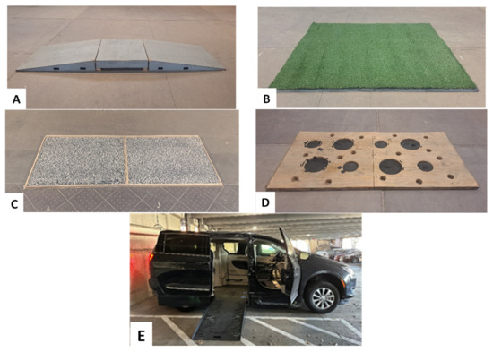 The wheelchair driving course included a curb cut, grass, uneven surface, pothole, accessible vehicle ingress/egress (Figure 3A–E) and docking in the vehicle using a WDS. The curb cut consisted of 5° up and down slopes with a transition surface. The grass task was 8.0 ft long × 6.0 ft wide of artificial turf (Make: TrafficMaster) installed on top of ¾” soft rubber tiles to simulate real grass. The uneven surface simulated driving on a gravel road (8′ long × 6′ wide). The pothole task used a plywood platform (8′ long × 4′wide) with several 1-inch-deep potholes of up to 12 inches in diameter. The ingress/egress task used a power ramp deployed by a study vehicle (Model: 2019 Chrysler Pacifica, modified by BraunAbility).