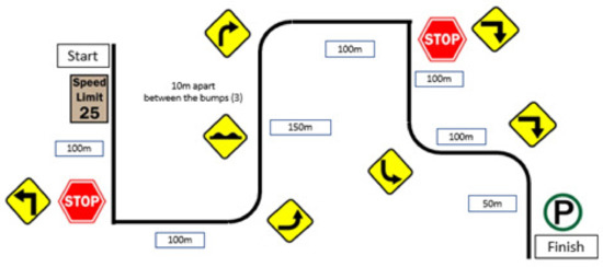 The vehicle riding test course included 3 left/right turns, 2 stop signs, and 3 consecutive speed bumps (Figure 4). Per IRB requirements, driving speed did not exceed 25 mph.