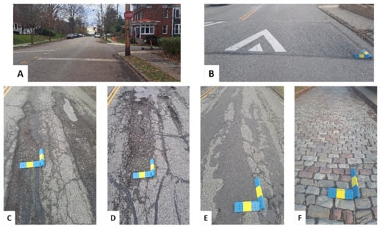 The vibration tests were performed with 7 different driving tasks: sudden brake, potholes 1 and 2, speed bump (3.8″ height × 11.5′ wide), uneven surface, and cobblestone up/downhill (Figure 5). Potholes 1 and 2 consist of sets of potholes that were formed naturally in asphalt pavement roads. Pothole 1 was a total 50′ long surface with multiple pothole dimensions of up to 18′ long × 3.8′ wide. Pothole 2 was a total 42′ long surface with multiple potholes, including 6.8′ long × 2′ wide, 5′ long × 1.2′ wide, 1.9′ long × 2.6′ wide, and smaller potholes. An uneven surface consists of an asphalt pavement road with a height difference between the original and the repaired road surface (265′ long). The cobblestone up/downhill was a total 400’ long with an approximate slope of 9.2°. The average size of cobblestone was 10.4″ long × 4.4″ wide × 0.4″ height above the surface plane. All vibration tests were conducted on public roads in low-traffic zones, following traffic laws and driving rules in the area.