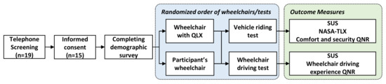 Aim 2 and 3—Wheelchair Driving and Vehicle Riding Tests: The usability evaluation of WDS in wheelchair driving (Aim 2) and vehicle riding (Aim 3) tests involved subject testing and was conducted at the Pittsburgh International Race Complex in Wampum, PA. The duration of the study was one visit up to 4 h long. Informed consent was obtained from participants upon their arrival at the study site. Participants were asked to complete a brief demographic survey (e.g., gender, ethnicity, age, disability etiology, driving experience, etc.). Later, participants were randomized in the order of wheelchair use (study wheelchair with QLX or wheelchair with own WDS) and tests (wheelchair driving or vehicle riding) to limit the wheelchair transfers to only 2 (Figure 6). Commercial power wheelchairs typically include a 4-TD to meet WC-19 standards [5]. Alternatively, wheelchair users may own an automatic WDS (e.g., EZ-Lock). Preceding testing, the study wheelchair with QLX was set up to the participant’s wheelchair driving and seating configurations. Participants were allowed to use their personal seat cushions if desired, and body supports were provided if needed. After transferring to the study wheelchair, participants received training and practiced using the device for about 15 min without difficulty as they drove a power wheelchair on a daily basis.