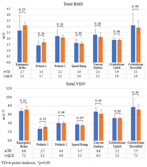 Vibration test results: The weighted RMS and VDV values of the QLX and 4-TD when riding a vehicle on different driving tasks are shown in Figure 7. WBV analyses did not reveal statistically significant differences between the 4-TD and QLX except when driving over a speed bump. In this case, the QLX (3.5 ± 0.1 m/s1.75) had a significantly lower VDV value than the 4-TD (3.7 ± 0.2 m/s1.75; p = 0.05).
