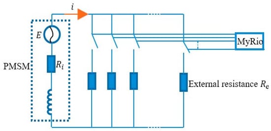 The torque of the motor in the EMD is controllable, and the ball screw can transform the torque into a force output. Figure 2 shows the simplified model of the EMD circuit. Multiple resistors are in parallel, and a myRIO can control their connections in the circuit. By adjusting the resistors’ switches, the circuit’s equivalent external resistance will change accordingly.