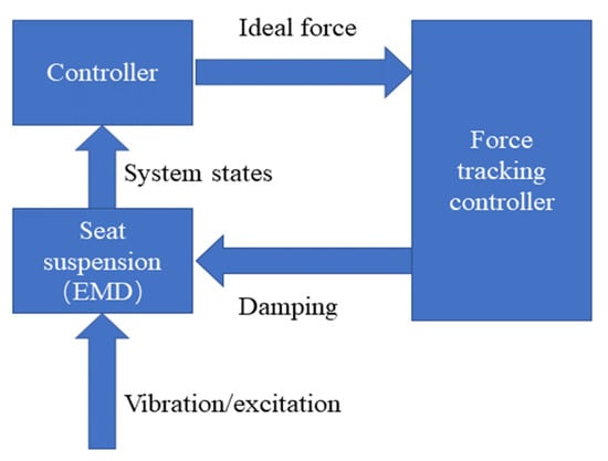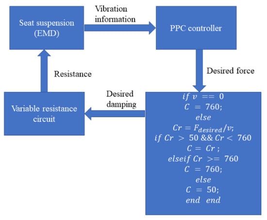 In this section, a semi-active controller with PPC is proposed for the variable damping system. The prescribed performance control method can not only ensure the steady performance of the system, but also meet the requirements of the dynamic performance design by limiting the tracking error of the system to the region constrained by the selected boundary function so that a reasonable performance constraint function boundary can be designed to limit the overshoot, adjustment time and steady-state error of the dynamic response of the tracking error. In this way, the desired control force requirements can be achieved. This seat suspension system also designs a force-tracking strategy in control, as shown in Figure 3. The EMD in seat suspension is used to provide controllable damping force according to the desired control force. The system states change when the vibration or excitation is transmitted to the seat through the suspension. Then, the controller will calculate an ideal force. According to Section 2, a change in the resistance results in a change in damping. In this way, this system can isolate the vibration.