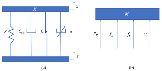 The whole seat suspension model is shown in Figure 4: Figure 4a is the simplified model of the seat suspension; Figure 4b is the free body diagram, where is the mass; is the spring stiffness; is the inherent damping, and it is mainly from friction; and is the force generated from the semi-active damper. In addition, is the seat response and is the excitation. Thus, the dynamic model is: