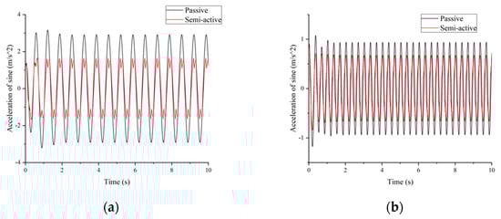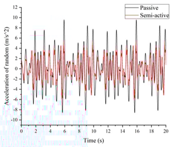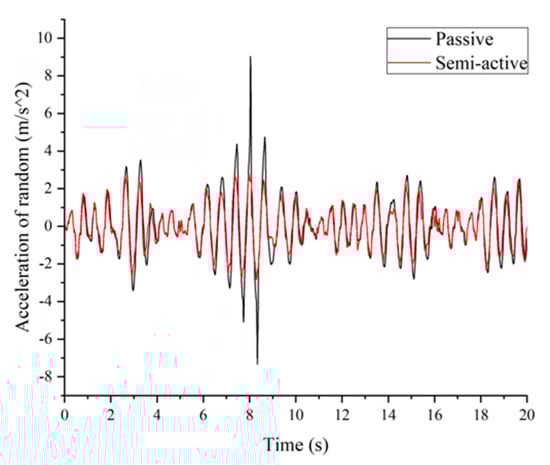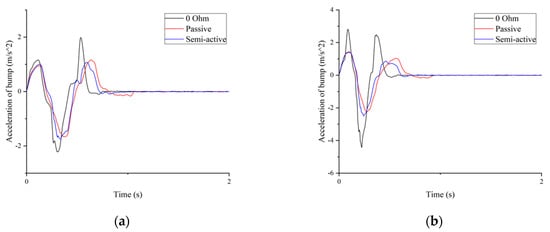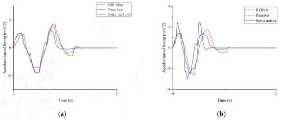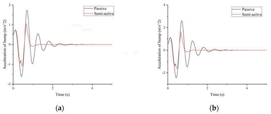 The acceleration comparison of bump signals of different frequencies is shown in Figure 14. The amplitude of the bump is , while the frequency is and , respectively. Figure 15 shows the acceleration comparison where the amplitude is and the frequency is and , as well. In these chats, the semi-active system has a lower peak value. The results demonstrate that the proposed seat suspension has better performance at the high frequency where the EMD has low damping.