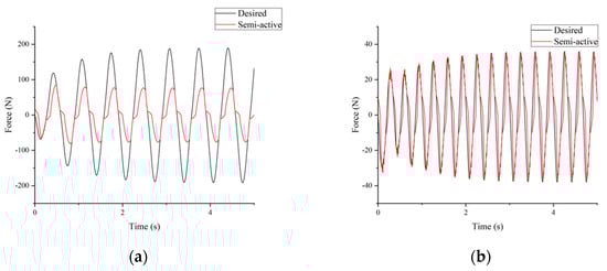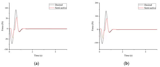 Figure 8 shows the response to bump excitation in the simulation. The peak-to-peak value in Figure 8 is for the passive system, and for the semi-active system in Figure 8a. Additionally, for the passive system and for the semi-active system are shown in Figure 8b. The reductions are and , respectively. Figure 9 shows the force tracking performance. The figures show that the semi-active system can follow the desired force for most situations.