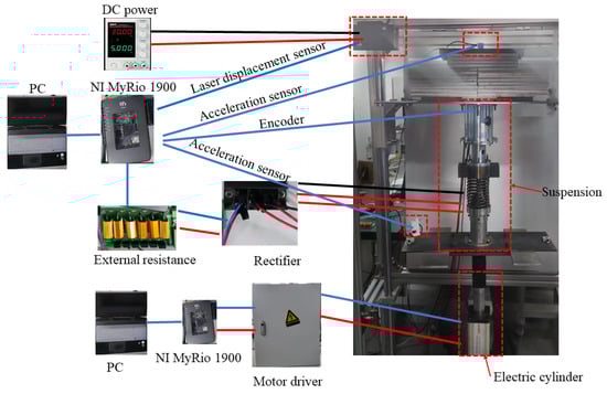 The test system consists of a frame made of aluminum alloy bars and an electric cylinder controlled by NI MyRIO, as shown in Figure 12. Two accelerometers, 1C101 of DONGHUA and ADXL 103, are used to measure the acceleration of the seat suspension. The rotary encoder, ORMOU E6H-CWZ, is used to test the rotary of the EMD for calculating the suspension relative displacement. Additionally, the seat suspension displacement is measured by a KathMatic laser displacement sensor whose measuring range is from to . The experimental system can be divided into three parts: vibration platform, test system and seat suspension. The single-freedom vibration platform, which is under the control of an NI myRIO, consists of a PC, a motor driver and an electric cylinder. Based on the PC’s command, the platform can generate different excitations. The test system consists of an acceleration sensor, a displacement sensor, an NI myrio and a DC power, which supplied power for the sensor.