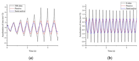 Figure 13 shows the seat acceleration comparison with different external resistors of the sine wave. In Figure 13a, the excitation amplitude is and the frequency is , which is the resonance frequency; the seat suspension shows resonance when the damping is small. The RMS value in Figure 13a is for the passive system and for the semi-active system, where there is a reduction. This illustrates that the semi-active system generates large damping to suppress the resonance vibration. For Figure 13b, the semi-active system has a performance close to the passive because the equivalent damping of the EMD seat caused by the friction in 3 Hz is close to the damping of the passive seat. In addition, the semi-active and passive suspensions perform better than the EMD suspension with 0 Ohm external resistance.