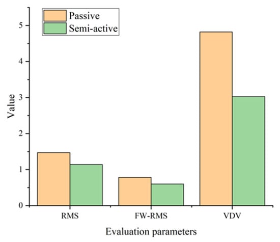 Finally, the random excitation is transmitted to the seat suspension in Figure 16. The passive seat has a high peak acceleration, and the semi-active seat suspension can effectively suppress the resonance vibration. The change of damping under control is shown in Figure 17. Figure 18 shows that position errors with prescribed performance are bounded for all times. Then, Figure 19 shows the evaluation parameters of acceleration according to ISO 2631-1. Compared to the passive system, the semi-active is improved by for RMS, for FW-RMS and for VDV.