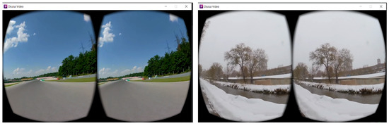 Visual conditions included in the study: (i) viewing 360° videos through VR HMD device and (ii) reading articles on a monitor in a closed cabin. The content used in the first condition was a combination of 360° videos with different motions from a car. Examples of these videos are shown in Figure 1. Subjects were instructed to skip any video causing discomfort. This enabled them to control the content they were experiencing while wearing the HMD device. The second condition, for instance, is similar to being in a vehicle without access to an outside view. Subjects were asked to read articles on the BBC news website in this condition. Table 1 highlights the differences between the contents of both visual conditions. The HMD device used in the current study was the Oculus Rift CV1 Headset device with 2160 × 1200 resolution (1080 × 1200 per eye) at 90 Hz refresh rate and the field of view (FOV) was 98.07°.