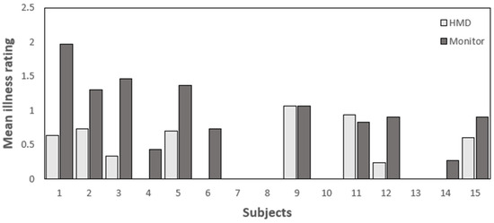 From Figure 3, although the HMD condition reduced the severity of sickness experienced by the subjects in this study, some subjects reported similar great sickness in both visual conditions. This suggests that having different visual contents through the VR HMD device with the option of controlling the content being experienced has no beneficial effect for all subjects, in particular, those who are unfamiliar with the use of the VR HMD device and susceptible to motion sickness. The positive effect of the HMD view on the severity of sickness may depend on various factors, such as individual differences (i.e., susceptibility to sickness), familiarity to the use of VR, content and specifications of display [31,32,33,34].