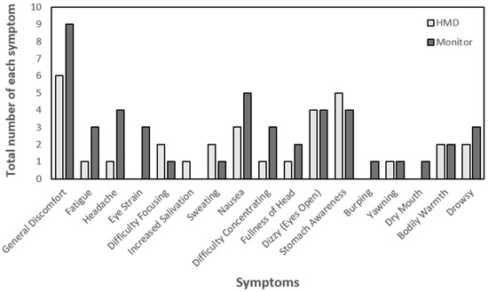 There was a significant difference between the two visual conditions in the total number of symptoms reported by subjects (Wilcoxon: p = 0.024). Similar to the illness ratings, fewer symptoms were reported by subjects after the exposure to motion in the HMD condition than in the monitor condition. Figure 4 shows the total number of each symptom reported by subjects after exposure to motion with the two visual conditions. From Figure 4, the highest symptom reported by subjects in each visual condition was general discomfort and nausea (n = 7 and 5, respectively, in monitor condition) and general discomfort and stomach awareness (n = 6 and 5, respectively, in HMD condition). The total number of symptoms reported by subjects was positively correlated with their accumulated illness ratings over the 30 min exposures to roll oscillation in both visual conditions (Spearman: rs = 0.869, p = 0.001 and Spearman: rs = 0.920, p = 0.001, respectively).
