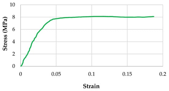 According to our previous work [], the proposed photosensitive resin (UV resin) material possessing rubber-like properties is chosen to be manufactured for a SP unit cell bridge bearing for compression testing, and the validation is also conducted for both static compression and shear analysis only. To perform simulations of this proposed model under cyclic loading with normal pressure variations, the model material is calibrated again with help of experimental results []. The model validation will be presented in the following section. Figure 5 shows the stress–strain curve of the proposed material used in the simulations of the model SP unit cell bridge bearing under cyclic loading. It is assumed that the material model has homogenous properties. It is to be noted that these stress–strain relationships from the curve below are calibrated in Abaqus [] as a bilinear curve with an approximate yield point to obtain correct data when simulating due to its elastic–plastic behaviour.