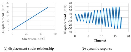 (a) applied horizontal displacement against shear strain (b) applied horizontal displacement against time history used for all the simulations of the model SP unit cell bridge bearing under both monotonic and cyclic loading, respectively.