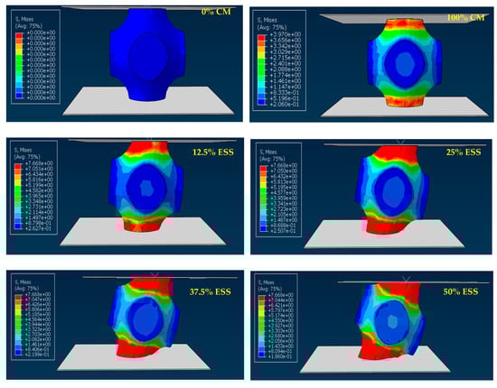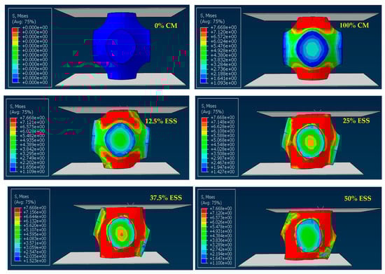 Furthermore, the stress distribution of the proposed model under monotonic loading with normal pressure variations between 1 MPa and 3.5 MPa, seen in Figure 8 and Figure 9, is identical at the initial state (12.5% ESS). After this, the proposed model considerably resists the relatively higher stresses induced in the whole part, resulting in the form of a structure block for accommodating higher horizontal displacements. It is important to note that the stress distribution of the proposed model subject to cyclic loading is the same pattern.