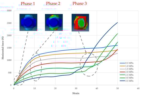 Force–displacement response curves for the proposed model subjected to monotonic procedure with variations in normal pressures are plotted in Figure 10 to present their static shear behaviour at low-to-target shear strains (50% ESS). Three ellipse markers are drawn individually to show the states where the deformation and stress distribution are initiated in elastic, plastic, and higher strain-hardening regions being wider in the horizontal direction, respectively. These markers are employed to categorise the three phases of the proposed model responses. According to Figure 10, the elastic behaviour of the proposed model is relatively insensitive to normal pressure at Phase 1, where only shear deformation in the top and bottom column parts occurs. With the increase in normal pressure, this leads to a reduced secant horizontal stiffness at Phase 2, but an increased one at Phase 3 due to its crashworthiness behaviour.