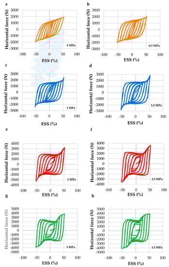 The predicted force–displacement hysteresis curves of the proposed model are plotted in Figure 11, in which Figure 11a,b,c,d,e,f,g and h are corresponding to 0, 0.5, 1, 1.5, 2, 2.5, 3, and 3.5 MPa, respectively. When the amplitudes of applied shear strains are small, the proposed model deforms absolutely in shear and exhibits narrow hysteresis loops, accounting for the nonlinear effects in its proposed material and complex porous structure. Nevertheless, the response of the proposed model at small shear strains is potentially considered as linear elastic, which is satisfied for this simulation modelling. Since the shear strains increase, the hysteresis loops become relatively wide and stable, showing decent energy dissipation in the proposed model under cyclic loadings. The increase in normal pressures causes development of a stiffening effect due to the change in applied loading displacement. Moreover, this effect is obvious when compared to the hysteresis loop of the proposed model under pure cyclic loading, as found in the Section 5. Despite the stiffening effect, the unloading branches of the hysteresis loops are typically parallel to the initial loading or reloading branches, demonstrating a decent match in shear stiffness.