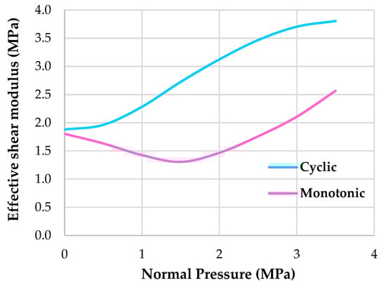 The calculated effective shear moduli of the proposed model for cyclic analyses at different normal pressures are summarised in Table 3. According to Figure 13, the effective shear modulus, Gec will normally increase with the increase in normal pressure for cyclic analysis. Unlike the other one, the effective shear modulus, Gem will basically decrease with the initial increase in normal pressure. When the normal pressure is higher than 1.5 MPa, the effective shear modulus increases because of the change in structure shape like a typical bearing’s block. It is important to note that the significant difference in the shear moduli of the proposed model between monotonic and cyclic conditions is fairly acceptable due to the effect of static and dynamic loadings on the behaviours of the proposed model [,]. The dynamic shear force obtained from cyclic analysis at 50% ESS is 1.6 times higher than the static shear force resulting from monotonic analysis at the same ESS, seen in Figure 10 and Figure 11. Another reason is that the proposed model subjected to cyclic loading will continue to resist higher shear strains induced the next cycle after the previous cycle.