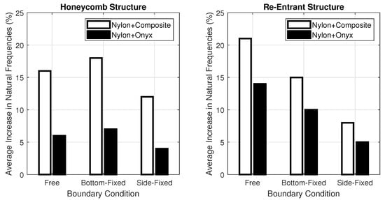 The topology parameters of lattice structures directly affect the mechanical properties and, by means of these parameters, lattice structures are tailored for fulfilling the needed properties. However, topology parameters are not only the main driver for changing the properties but also for the constituent material influences the mechanical properties. Especially, the utilization of a multi-material approach provides optimization of the lattice structure in accordance with the design requirements. For example, carbon-fibre-reinforced lattice structures are exploited in the parts of lattice cell structures in which high buckling loads are needed. The improvements in additive manufacturing create an opportunity to produce multi-material lattice structures and fibre replacement is also possible within limited directions. The knowledge of re-entrant and honeycomb lattice structures has been improved and the cell geometry can be optimized topologically for specific applications to date. However, what is not known and what is limited is how a specific material or materials will function when used in part of the cell structure, especially for continuous or chopped fibre replacement in some parts. Further research is necessary to understand what multi-material configuration can be utilized in a specific part of the cell to optimize the cellular structure’s structural efficiency for its desired application. In this study, an original contribution was made to understand the free vibration characteristics of the honeycomb and re-entrant lattice structures when the multi-material configurations are utilized. The multi-material configurations were achieved by the substitution of material of parallel ligaments converted into continuous (CFRN) or chopped carbon-fibre composite (Onyx). The effects of this configuration on the natural frequencies were investigated by comparing the correlated mode shapes of the lattice structures.