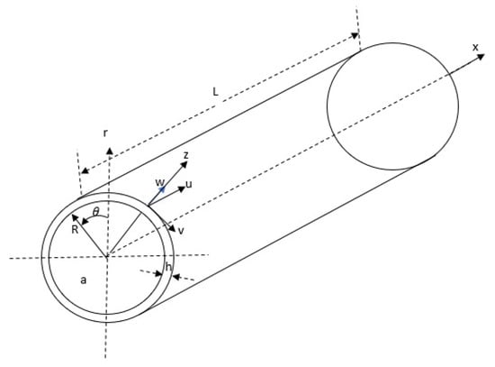 In this study, we use a simplified equivalent model of the cavity and a cylindrical coordinate system of for a cylindrical shell which has length L, thickness h, and radius R. The displacement functions for this cylindrical shell are , and r directions. The thickness of the shell is assumed to be uniform and very small, compared to the length of the cylindrical shell []. Hence one can apply shell theory for structural modeling.
