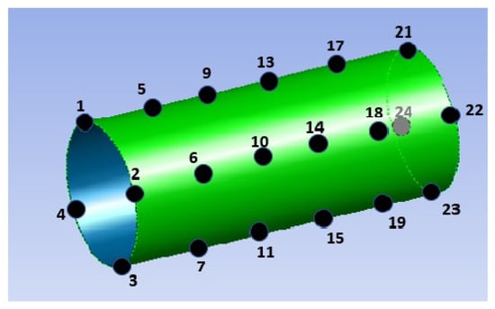 The boundary conditions are that we only have access to the both ends of the cavity. By applying pairs of forces we want to cancel out some modes of vibration. Considering our constraints, we apply two equal forces to the both ends in the opposite direction of each other. Simulation analysis is carried out through 24 points selected by 4 points for longitudinal direction and 6 points for circumferential direction as shown in Figure 8. In the first attempt of the simulation, the first force has been applied to the node 1, and the second force to the node 23.