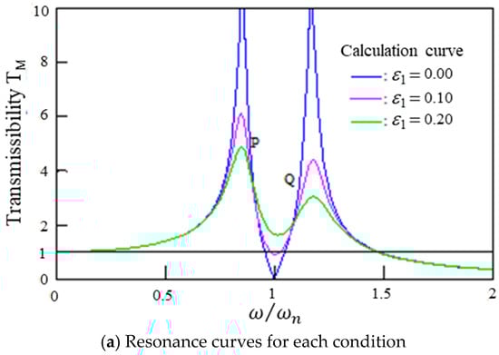 Figure 5 shows the resonance curve of the optimally designed 2-DOF system obtained using these equations. The transmissibility at the resonance points was confirmed to be the same.