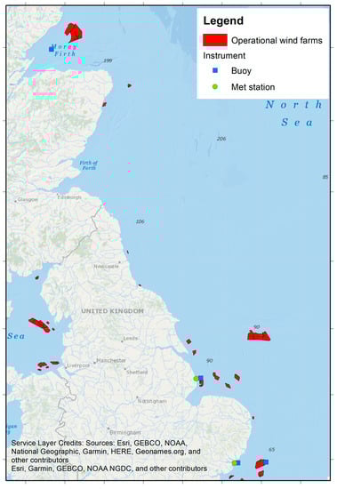 The study area covered latitudes between 51° N and 59° N in the North Sea. This was because VMMS data were collected from vessels deployed in four different wind farms in the North Sea which were operated by four different wind farm operators for spatial variability. The plot in Figure 1 presents a map of the North Sea area, showing operational offshore wind farms in the United Kingdom and the relevant available buoys and met stations considered in this project for metocean data validation. While the map shows operational wind farms in the region, the specific wind farms used to achieve the research aims are not highlighted, following the terms according to which the project data were made available.