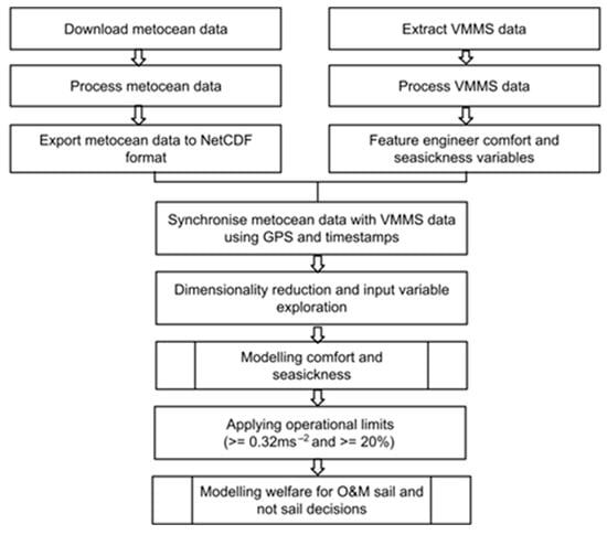 The objective of this research was to develop a dual-criterion welfare model that aids sailing decisions using proxy variables of the composite weighted RMS acceleration (aWRMS) and motion sickness incidence (MSI) to represent the levels of comfort and the likelihood of seasickness of technicians, respectively. Figure 2 presents the project workflow for achieving the research aim.