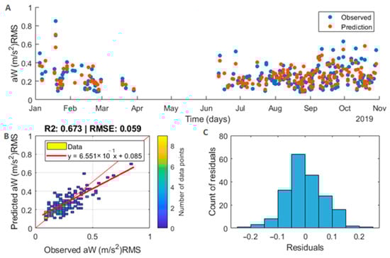 Plots showing the model performance. (A) A response plot showing observed (measured), in blue, and predicted composite weighted RMS acceleration (aWRMS), in orange, with time. (B) The correlation between predicted and observed aWRMS (m/s2) showing the density of data points. (C) A histogram of residuals.