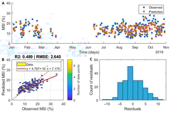 Plots showing the model performance. (A) A response plot showing observed (measured), blue, and predicted motion sickness incidence (MSI), orange, with time. (B) The correlation between predicted and observed MSI (%) with a density of data points. (C) A histogram of residuals.