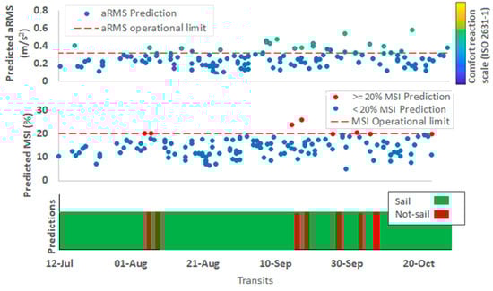 To predict sail and not-sail decisions, operational limits are applied to the model outputs of the aWRMS and MSI based on the operational limits defined by ISO 2631-1 for providing an approximate human comfort response to accelerations, and the best seafaring practices for limiting the incidence of motion sickness [,]. The limits applied include the categorisation of increasing values of RMS acceleration above 0.315 ms−2 as progressively uncomfortable and MSI values below 20% as limits of acceptable conditions. Therefore, the model created is based on a dual-criterion system established from magnitudes of predicted weighted acceleration and the predicted incidence of vomiting. Figure 5 presents the results of the technician welfare model with predicted sail and not sail decisions over three months.