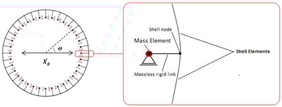 Despite the variety of techniques in fluid modeling in tank FE modeling, one can categorize them into two main classes: using specific fluid elements and employing the added-mass method. It is worth mentioning that utilizing fluid finite elements covers a variety of FE-based procedures. Eulerian and Lagrangian approaches are two classical descriptions of motion in fluid–structure interaction problems, such as tank hydrodynamics []. The crucial drawback of Lagrangian FE procedures is that they are inappropriate for large deformations [], whilst Eulerian methods are not sensitive to large movements. Therefore, for the fluid–structure interaction problem of a tank subjected to seismic actions, one can also deploy the Eulerian–Lagrangian approach that utilizes an Eulerian mesh for fluid and Lagrangian one for the tank structure []. Utilizing the specific FE mesh for the tank’s content, one can precisely simulate the tank and its content’s seismic behavior (See Figure 2). Therefore, numerous researchers have employed this procedure to assess the seismic performance of tanks [,,]. However, its most significant shortcoming is that it is time-consuming and requires considerable memory space. On the other hand, it may encounter convergence problems. Further, depending on the selected FE procedure, some may not be appropriate for solving problems in which the large deformation is significant. Hence, some scholars and practicing engineers prefer to utilize the added-mass procedure. The idea of effective mass applies to silos and liquid containers []. Westergaard [] was the first researcher that proposed the added-mass approximation to consider the dam–reservoir interaction. In this method, the effective liquid mass is added to the tank wall to account for the inertia of the liquid during the tank vibration. Barton and Parker [] implemented added mass approximation in cylindrical tanks. They considered the effective mass of liquid utilizing two different approaches. In the first approach (so-called enhanced density model), they artificially increased the density of the tank shell material up to the level of the liquid surface to consider the mass of the tank’s content. The crucial drawback of this assumption is that it is attributed to every degree of freedom at the shell nodes, and not only in the radial direction. This attribution is not consistent with the actual behavior of the tank-content system []. In the second approach, they utilized SDF mass elements and added them to every node on the tank shell under the fluid surface. They uniformly distributed 72% of the fluid’s mass to the tank shell. This assumption is also inconsistent with the actual behavior of the content during the dynamic tank–fluid interaction, which deals with the non-uniform distribution of the hydrodynamic impulsive pressure. In recent years, many researchers have utilized mass elements for modeling the content [,,,,]. They connect the nodal masses to the shell nodes using massless rigid links and restrain all degrees of freedom of the mass element except in the radial direction (see Figure 3). Through this technique, they are able to attribute the added mass only to the radial direction. In addition, they derived the value of nodal mass from the impulsive hydrodynamic pressure. This assumption is significantly more convenient with cylindrical tank hydrodynamics compared to uniform mass distribution. The impulsive pressure at a particular node of the tank shell ( is a function of its distance from the tank base (z) and the angle between that node and the direction of strong ground motion ( It can be formulized as follows: