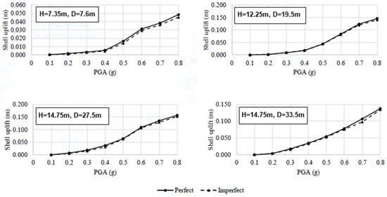 Comparison of the average tank uplift of perfect and imperfect tanks obtained from ten sets of incremental dynamic analyses (regenerated from []).