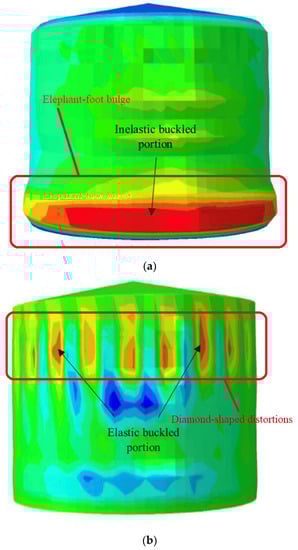 Since steel cylindrical tanks are generally thin-walled structures, shell buckling is one of their most frequent failure modes. Therefore, several researchers have focused on the buckling assessment of steel cylindrical tanks because of earthquakes. As indicated in Figure 6, depending on the relative thickness of the tank’s shell, they may buckle in any of two forms: inelastic (elephant’s-foot buckling) and elastic (diamond-shaped buckling). While inelastic buckling that usually takes place in relatively thicker shells, elastic buckling often occurs in comparatively thinner ones [,]. It is worth noting that the main difference between the elastic and inelastic forms of buckling is that before the elastic buckling, no plastic strain is generated in the buckled areas of the shell [].