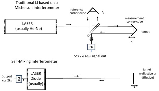 Following a number of variants from several manufacturers, like the one reported in Figure 1 (top), the LI was then basically made around a λ-stabilized He-Ne laser and an external optical interferometer—typically, a Fabry–Perot configuration. The two beams propagated to the target being measured at distance s and to the fixed reference path sr were superposed at a detector, generating a signal I = I0 cos 2k(s − sr), where k = 2π/λ is the wavenumber [28].
