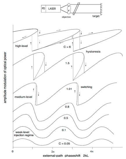 In Figure 4, we can see the evolution of the amplitude waveform ER. The evolution is governed by the feedback parameter C, which is proportional to the distance times the fraction of returning field [29]. At small C (say, ≤0.05), the waveform of the SMI field ER is sinusoidal, and the output signal detected by the photodiode PD follows the dependence I = I0 cos 2ks of a normal interferometer (Figure 4, bottom traces). At increasing feedback, we first notice a distortion in the cosine waveform, with the leading edge becoming slower than the trailing edge (C = 0.1 to 0.8 in Figure 4). Then, we obtain switching from top to bottom at increasing phase shifts (C ≥ 1), which will become a bottom-to-top when phase shift ϕ = 2ks decreases [24,25].