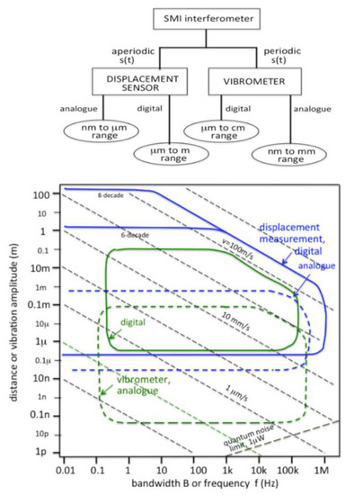 The performance of SMI displacement and the vibration SMI instrument with respect to the measurable amplitude and bandwidth of s(t) is summarized in the chart shown in Figure 5 (bottom).