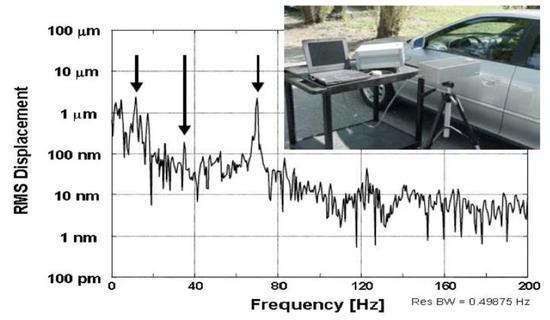 Vibration modes of a car structure are obtained by aiming the device at a door of a car. The motor rotates at 35 Hz, and two other major peaks are seen, due to spikes at 70 Hz and to the suspension resonance at 13 Hz. Many other (unidentified) peaks are found in the structure because their intensity is well above the 100 pm noise floor of the instrument (from Ref. [34], ©IoP; reprinted with permission).