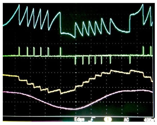 An example of waveforms obtained using the SC circuit is shown in Figure 13. Here, a loudspeaker with a cone covered with untreated white paper was used as the diffusive target. It was driven with a sine wave, yielding a peak-to-peak signal amplitude of 5 μm at 20 Hz; the wavelength of the laser was 780 nm, and the feedback factor was estimated to be C ≈ 3. Similar waveforms were also observed for peak-to-peak signal amplitudes from 400 nm to 20 μm, in a range of frequency going from 0.1 Hz to 100 Hz [40].