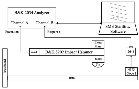 The Brüel & Kjær 8202 impact hammer, Nærum, North Denmark, Denmark, (excitation) was used to individually gently tap each of the 38 nodes of Table 1 in succession, as outlined by Kuttner [20] and Irvine [21]. Rim nodes 1–8 were struck in the -Z direction, and backboard nodes 9–38 were struck in the -X direction. The fixed location of the Brüel & Kjær 4393 accelerometer (response) was node 1, and the accelerometer was oriented in the vertical +Z direction as declared in New Project, Figure 1. The Brüel & Kjær 4393 accelerometer was adhered to the rim via beeswax.