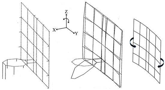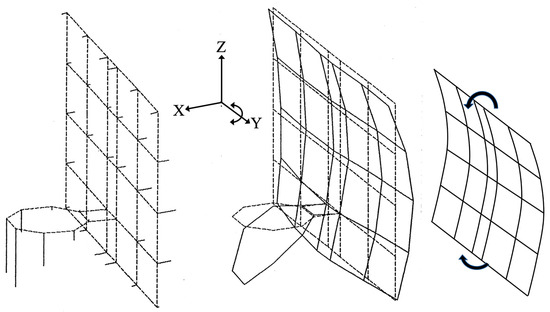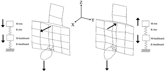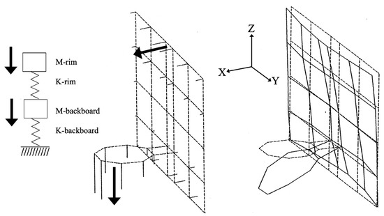 A lot was happening in Figure 7 and Figure 8. However, a first-order approximation is that modes 3 and 4 were influenced by the backboard plate bending as a simple plane. In Figure 7, the plane of the backboard was bending about the Z (vertical) axis (my = 0, mz = 1). However, in Figure 8, the plane of the backboard was bending as the Y (horizontal) axis (my = 1, mz = 0). Since the Y dimension of the backboard was 1.83 m and the Z dimension was shorter at 1.22 m, per Table 6, the modal frequency of 41.54 Hz in Figure 7 is lower than the modal frequency of 51.45 Hz in Figure 8. The circular rim (nodes 1–8) appeared to be hinging where it attached to the steel mount bracket (nodes 4–9–16–5).
